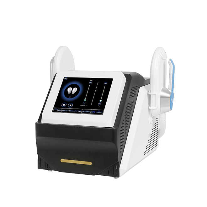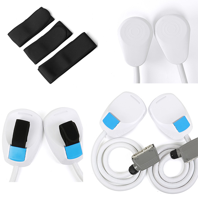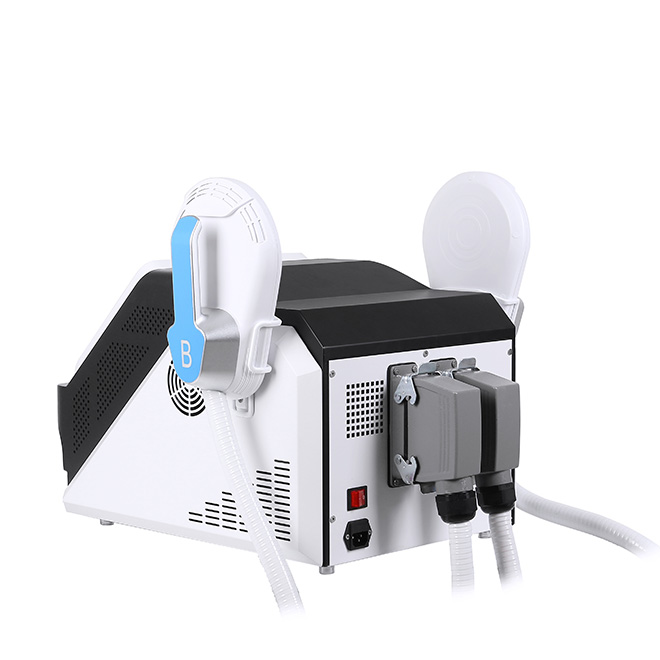 HIFEM skönhetsmuskelinstrument har två behandlingshandtag, som stödjer synkroniserat arbete;den kan manövreras av två personer samtidigt, och kan placeras i buken, rumpan, överarmen (biceps, triceps), lår och andra delar.