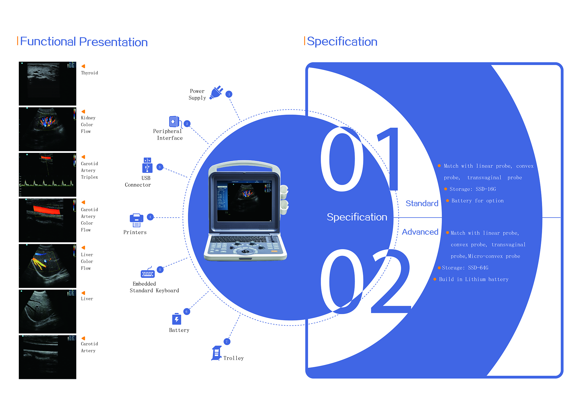 Standart konfigürasyon | Ana ünite, 12 inç LED monitör2 Prob konektörleri, Kullanım Kılavuzu, sabit disk (SSD) Doğrusal prob, dışbükey prob, transvajinal prob ile eşleştirin Depolama: SSD-16G Seçenek için pil |