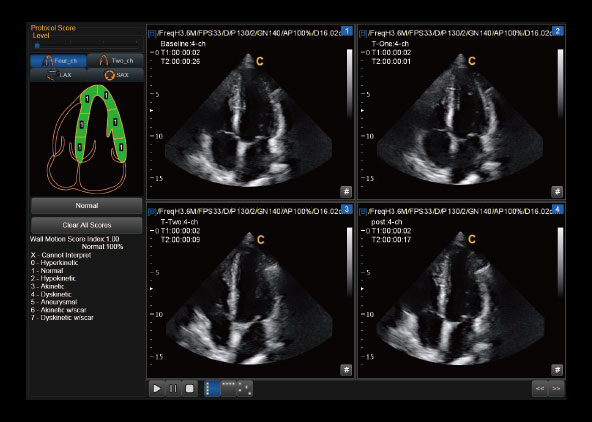 Bir stres ekokardiyogramı, fiziksel strese yanıt olarak duvar hareketini değerlendirmek için kalbin ultrason görüntülemesini kullanır. Egzersiz ve farmakolojik stres protokolleri, kullanıcı tarafından yapılandırılabilir şablon düzenleyici sağlar.