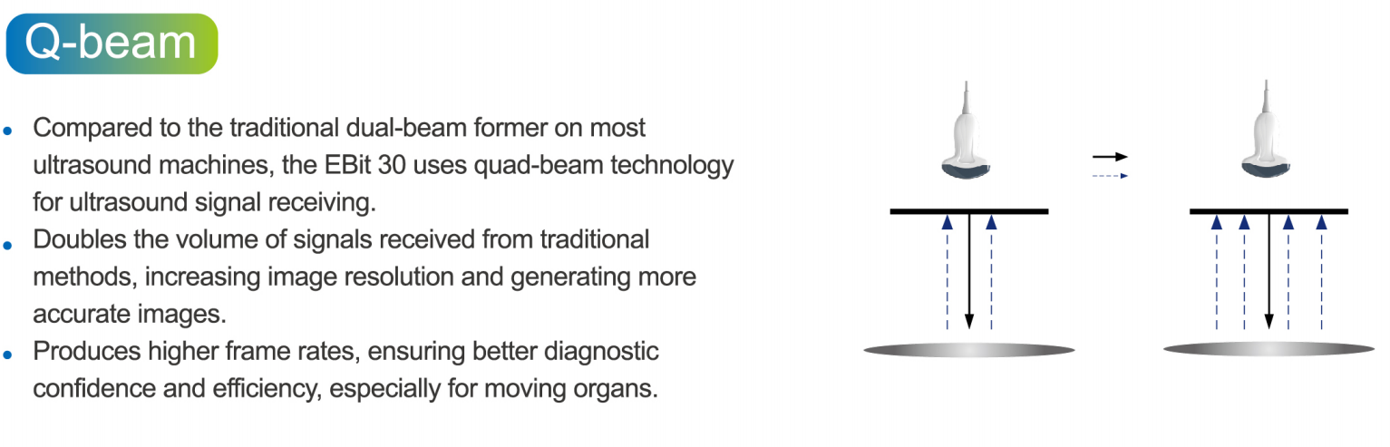 Çoğu ultrason makinesinde bulunan geleneksel çift ışın oluşturucuyla karşılaştırıldığında, Ebit 30, ultrason sinyali alımı için dört ışın teknolojisini kullanır.