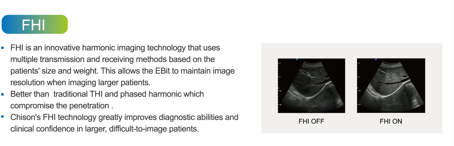 FHI, hastanın boyuna ve kilosuna göre çoklu iletim ve alma yöntemleri kullanan yenilikçi bir harmonik görüntüleme teknolojisidir.Bu, Ebit'in daha büyük hastaları görüntülerken görüntü çözünürlüğünü korumasını sağlar Penetrasyondan ödün veren geleneksel THI ve aşamalı harmonikten daha iyidir Chison'un FHI teknolojisi, daha büyük, görüntülenmesi zor hastalarda teşhis yeteneklerini ve klinik güveni büyük ölçüde geliştirir