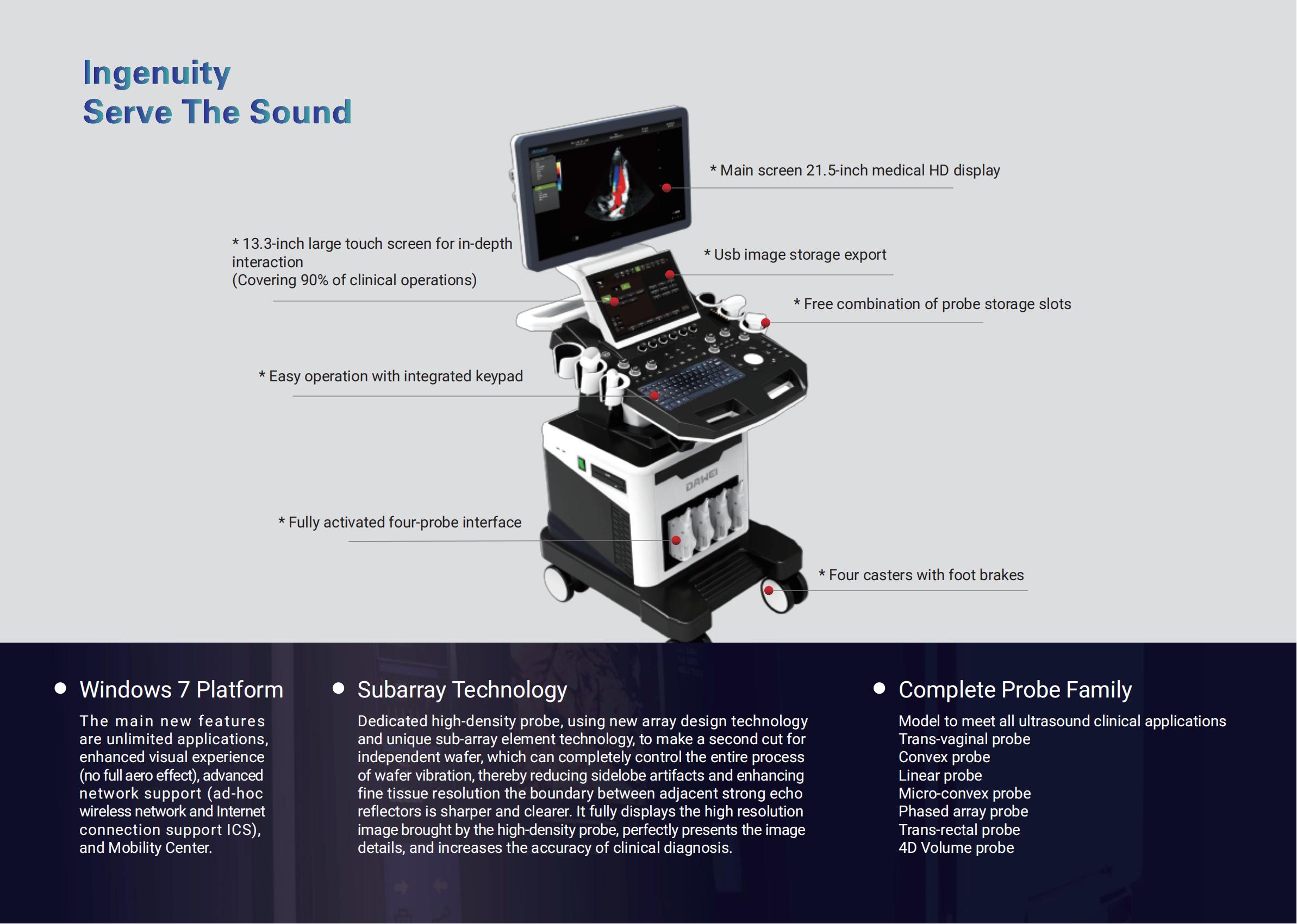 Convex probe, Tran-vaginal probe, Linear probe, Micro-convex probe, Cardiac probe,4D Volume probe