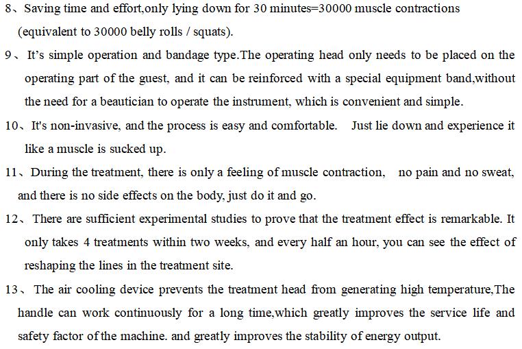 HIFEM beauty muscle instrument has two treatment handles, which support independent and synchronized work; The treatment parameters of both handles can be adjusted independently; it can be operated by two persons at the same time, and can be placed in the abdomen, buttock, upper arm (biceps, triceps), thigh and other parts alone or at the same time.