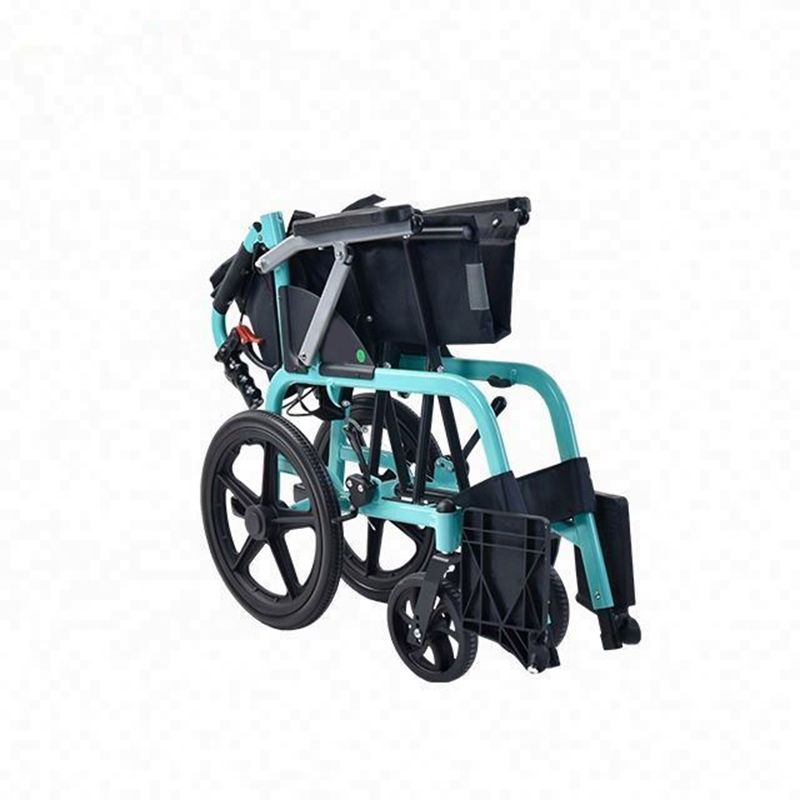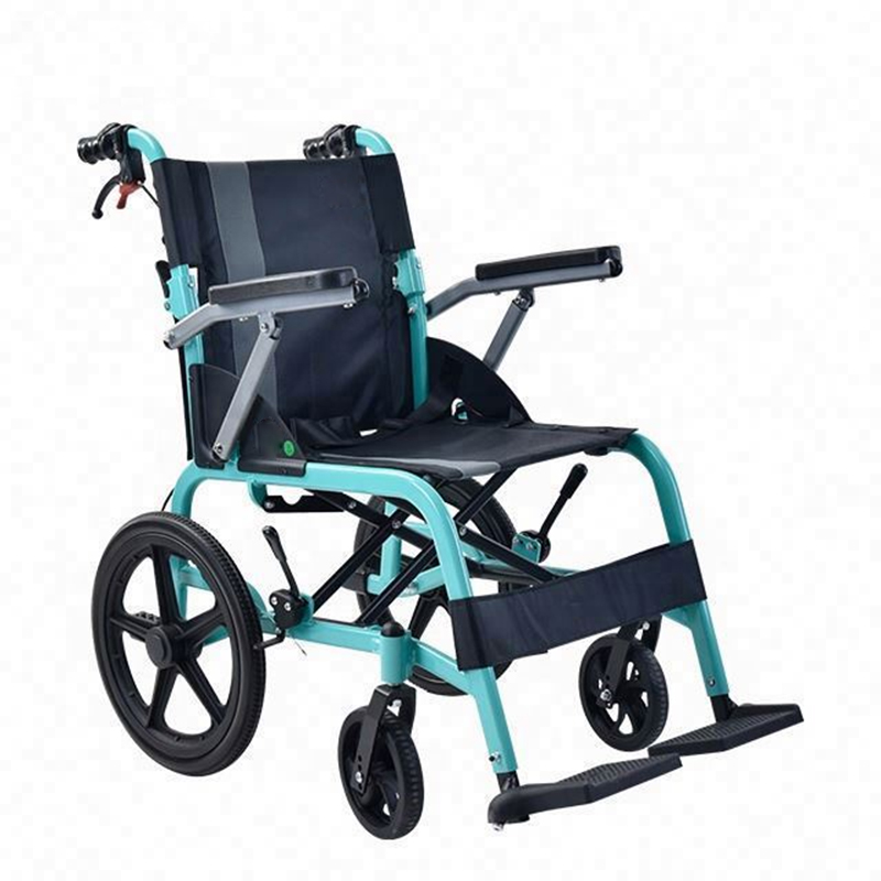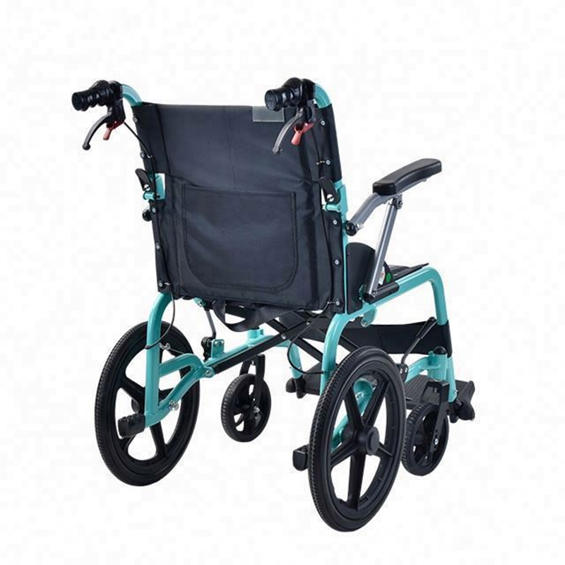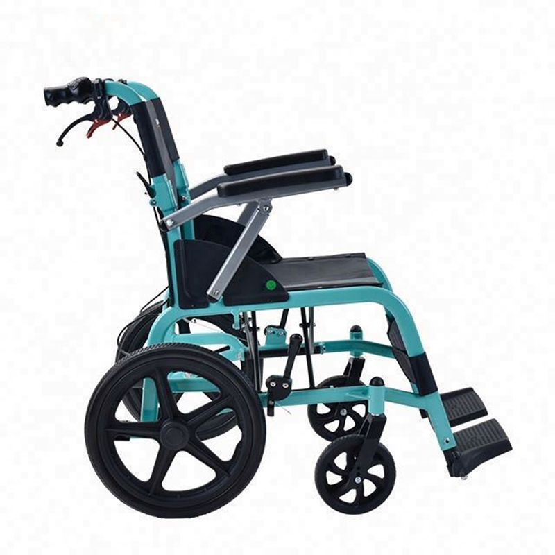 * Powder coating aluminum alloy frame,* Tube: 30mm* 18mm* 2mm.* Flip-up armrest and foldable backrest.* Oxford fabric upholstery.* 2 staged braking system: hand brake and rear axes brake.* With hand massage handle.* With strong seat belt, adjustable length.* Fixed legrest with swing out footplate and calf strap.* 7-inch PVC caster, 16-inch PU rear wheel.