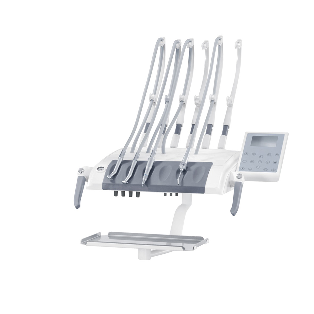 The dental unit adopts the new-type long-lived lamp arm, novel induction dental cold light lamp, integrated ceramic gargle cuspidor and airlock balance arm, all add luster to the unit. Its high/low-speed hand piece adopts the independent water supply system, which can prolong the service life of the hand piece. Compared with the four-holed hand piece, the two –holed hand piece has the extra exhaust and scrap-blowing function. The cooling water has the extra suck back-proof design that can prevent cross infection between patients. It adopts three way syringe 2 pieces for hot and cold and the dual (strong/weak) saliva ejectors.