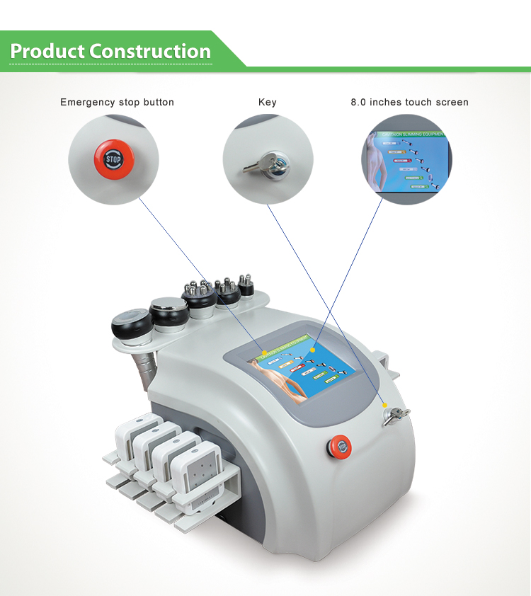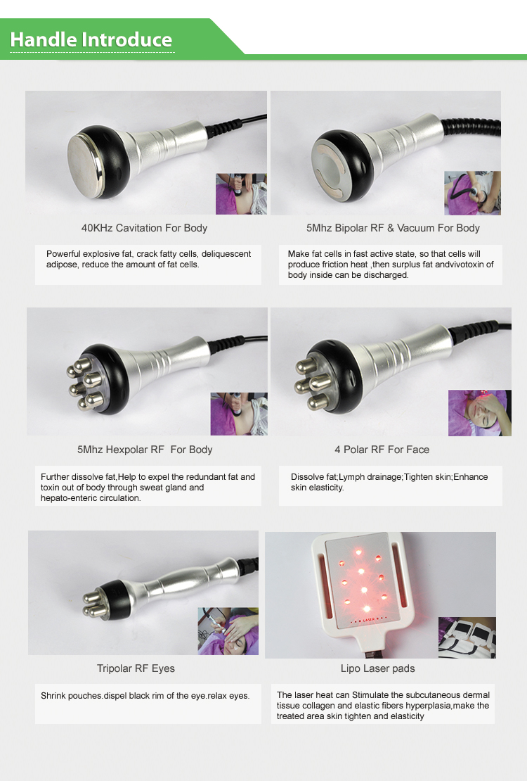 A, 5 Mhz Hex-polar RF és principalment per al contorn del cos; B, 5Mhz Bipolar RF & Vacuum és per a la forma del cos; C, 5Mhz Bipolar RF és aixecament i estrènyer facial; D,5Mhz RF tripolar s'utilitza en els ulls que esborren bé alineeu i elimineu el cercle fosc sota l'ull; E, la cavitació de 40Khz és la funció principal d'aquest tractament i utilitzeu ultrasònics de 40Khz per resoldre el greix. .F, el làser Lipo envia senyals a les cèl·lules adiposes per trencar el greix emmagatzemat, donant lloc a la pèrdua de greix.