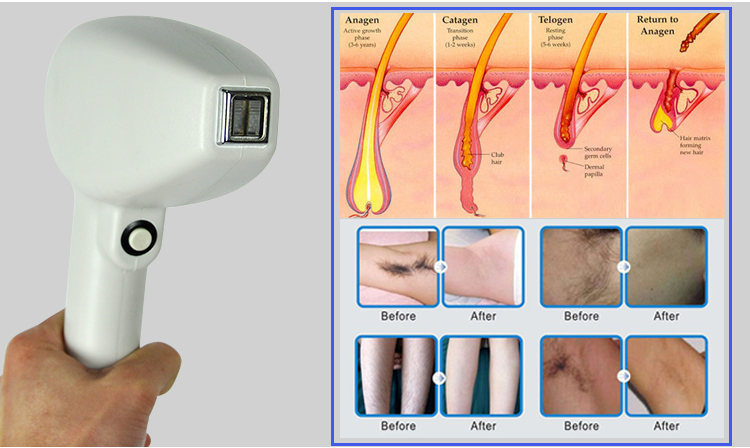 ʻO ka lōʻihi o ka pulse e hōʻoiaʻiʻo i ka loaʻa ʻana o ka pōʻino wela i ka ʻiʻo i hoʻopaʻa ʻia, akā ʻaʻole i hoʻopilikia ʻia ka ʻiʻo a puni; ʻO ka nui o ka ikehu kūpono, e hōʻoiaʻiʻo ana i ka loaʻa ʻana o ka ikehu i ka manawa kūpono, hōʻino i nā ʻiʻo i hoʻopaʻa ʻia, ʻaneʻane pili ʻole nā kiko maʻamau; A ʻO ke ana palekana epidermal kūpono e hōʻoiaʻiʻo ai i ka pōʻino kūpono i ka ʻiʻo i hoʻopaʻa ʻia ʻoiai ʻaʻole i hoʻopilikia ʻia ka epidermis, a laila e hōʻoiaʻiʻo ai i ka palekana o ka mālama ʻana.ʻOiai e hālāwai ana i nā koi hoʻolālā i luna, ua hoʻolālā ʻia kahi laser multipulse kūikawā mai ka ʻohana laser semiconductor hair removal laser i nā follicles lauoho i 48 ° C ma ke ʻano o ka haʻahaʻa haʻahaʻa o ka ikehu a mālama i nā follicles lauoho a me ka ulu ʻana (ma 10 Hz) no kahi manawa ma o sliding therapeutic hand-held instruments.Stem cell lost their growth activity.Using slippage hair removal technology, it can reach not only the effect of hair removal, but also the effect of shrinking the pores, whitening the skin, and tightening the skin.