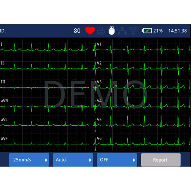 Performance:* 12-lead synchronous acquisition and display* Glasgow ECG analysis algorithm can accurately trace and diagnose the cardiac abnormal waveforms* Support pacemaker detection* Digital sampling rate: 32000Hz* 0.01-350Hz ultra-wide frequency response improves the detection of tiny waveform* Original ilter”adaptive fitering technology has greatly improved the ECG signal quality* Manual/Auto printing: 3×4, 3×4+1, 1×12 formatsFeatures:* 5-inch high resolution LCD screen* The lightest 3-ch ECG, only 1.2kg* Alphanumeric keyboard design* Optional touch screen for better operation experience* Support Z-fold and roll thermal recording paper* ECG data can be saved as HL7, XML, PDF, PNG, JPG, DICOM, GDT or ZQECG format* Support data transmission to PC via LAN port, USB port, SD card and WIFI* Support paperless records and storage of electronic cases, the machine stores more than 1500 cases